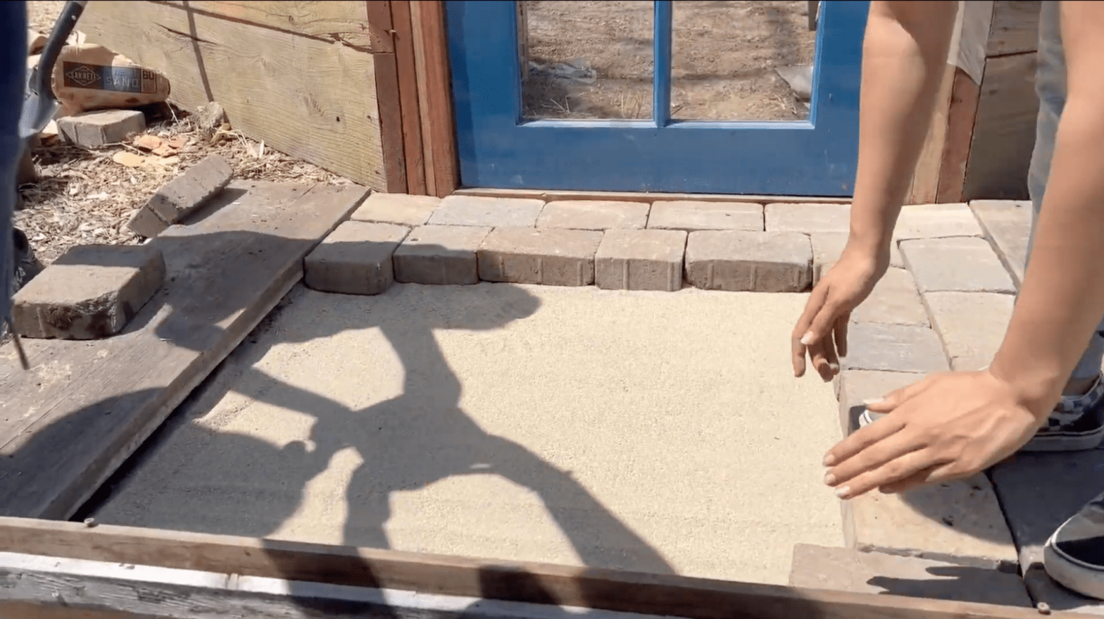 After we transported all of the bricks, we moved on to the design part. We set up a palette and got to work trying to arrange the bricks to look nice. There were a few different types of sizes that the bricks came in and at different counts too, so this process took a while until we found a design that satisfied us. We then worked to clear the space in front of the door. We used sand to help keep the floor as level as possible as it would conform to the placement of our bricks and we filled the gaps between the bricks with it after completing the design. With the entrance done our greenhouse looks a bit more presentable and closer to being finished.