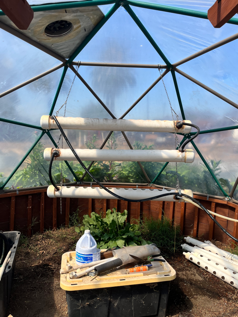 Next, and the most important part, the hydroponics system. After much trial and error, we got a working system that takes water from a container outside of the greenhouse, through 3 pipes inside the greenhouse and back outside to the container.